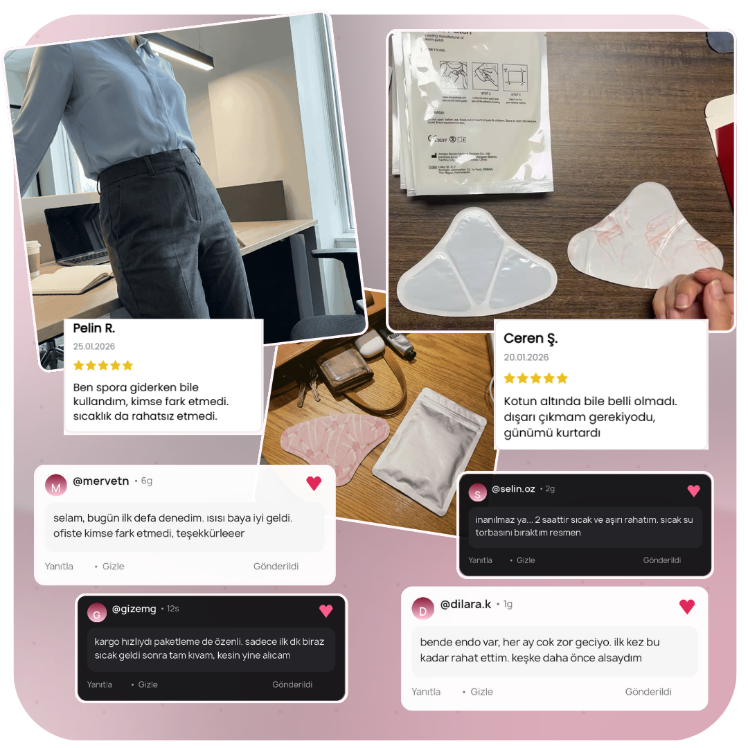 Regl kaynaklı karın rahatsızlığı için alt karın (abdominal) bölgeye uygulanır. İstersen bel/alt sırt gibi sıcaklık istediğin bölgeye de kullanabilirsin.